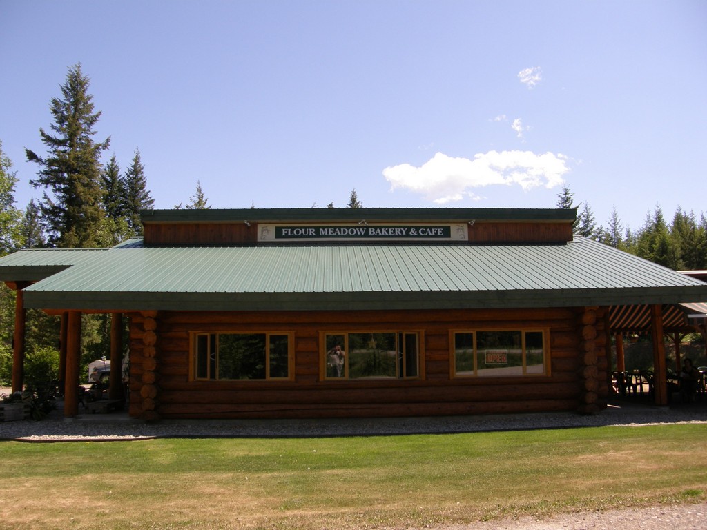 Ecco che prima di arrivare alla strada principale, la nostra attenzione è attirata da un fantastico cottage in legno a bordo strada, immerso nel verde. Sul fronte del tetto la scritta “Flour Meadow Bakery & Cafè”. Dopo ore di solitaria in auto, ed un panino veloce, perché non regalarci un dolcetto nella natura?. Ci fermiamo, posteggiamo e troviamo subito una splendida roccia disegnata e colorata avente le sembianze di un orso, veramente carino. Entriamo in un caldo ambiente da tipico Chalet di montagna,ci colpisce una vetrina con pasticcini di ogni genere e specialità locali sfiziose. Prendiamo la nostra ordinazione dalla ragazza al bancone e ci sediamo sui tavolini esterni a degustare un latte e cioccolato che ci ricorda tantissimo quando eravamo bambini, tra il cinguettio degli uccelli, i profumi del bosco e una brezza che ci culla candidamente.