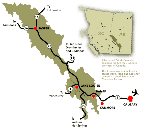 Qui di seguito riporto la cartina della zona particolare che vedremo in questa sezione, l'Icefield Parkway, i parchi Nazionali di Banff & Jasper e pian piano anche gli altri collegati a quest'ultimi.