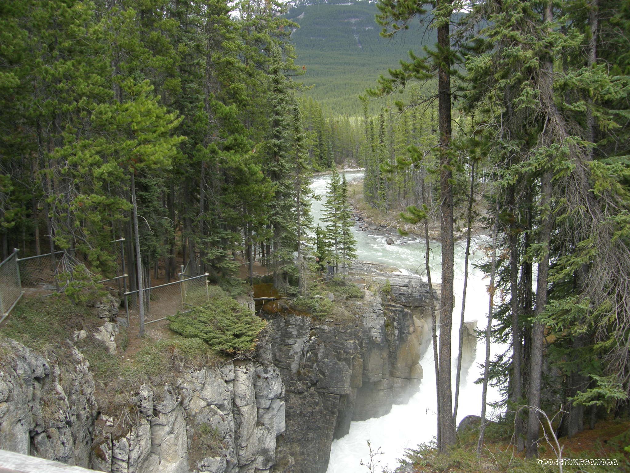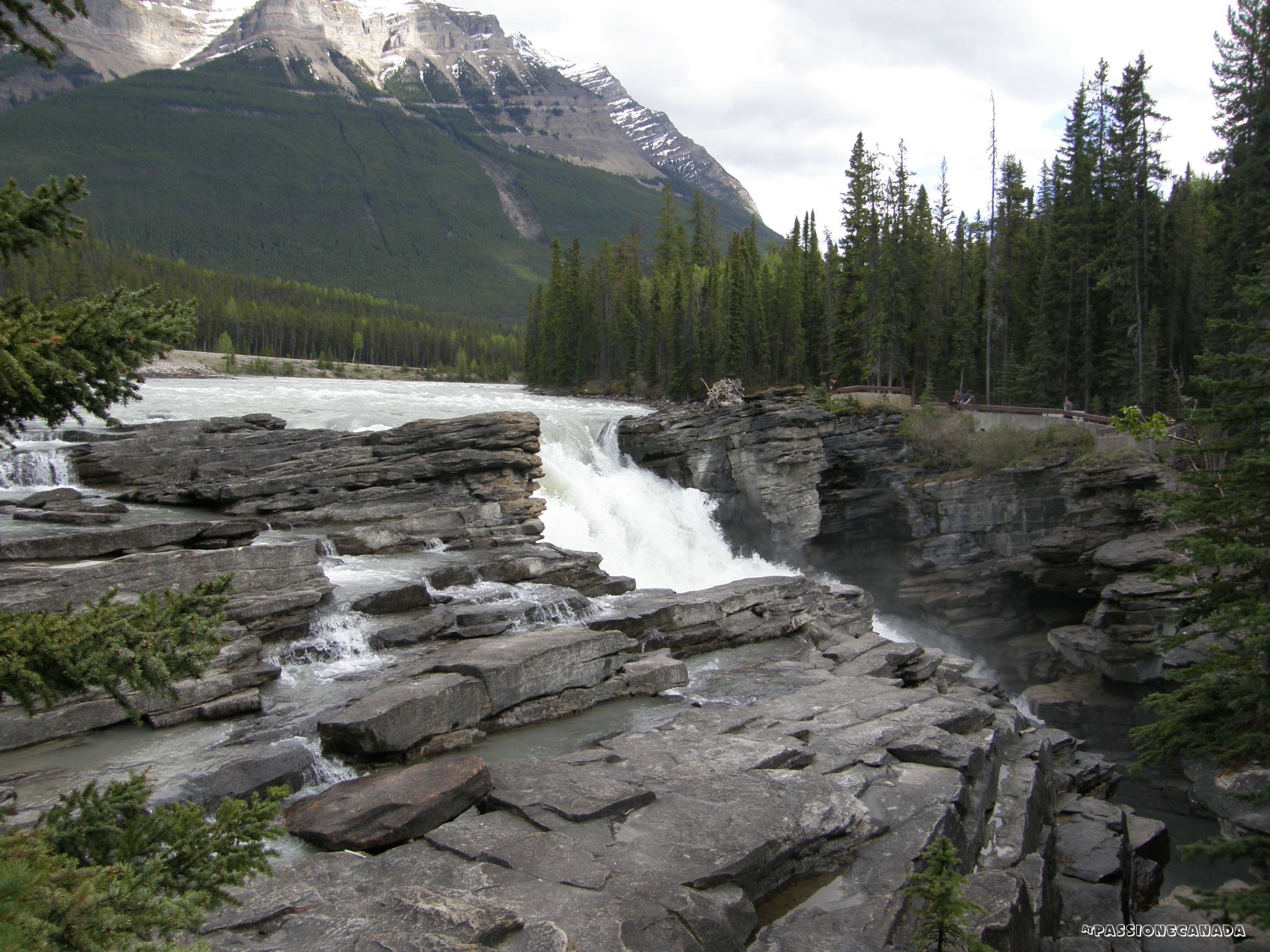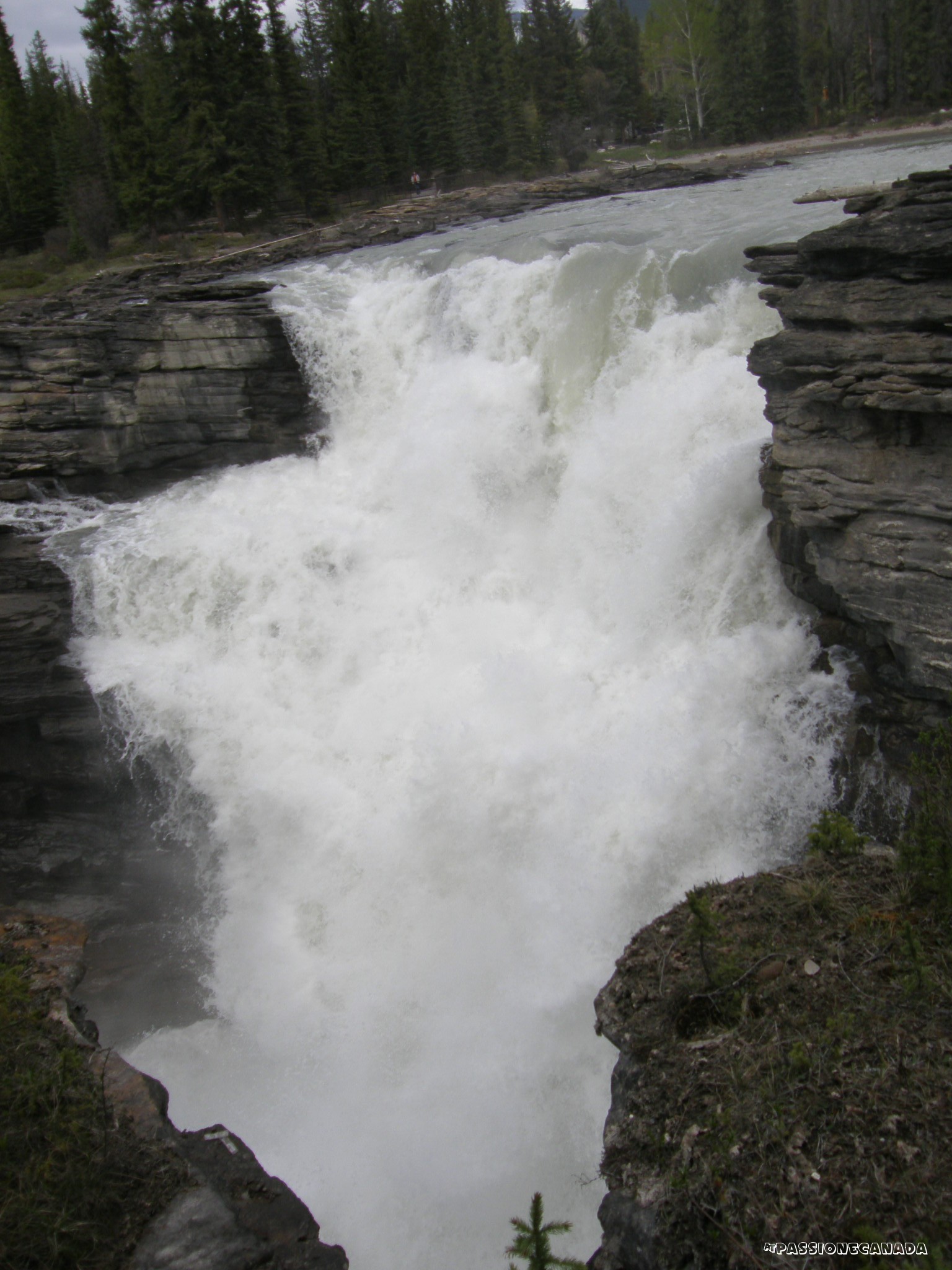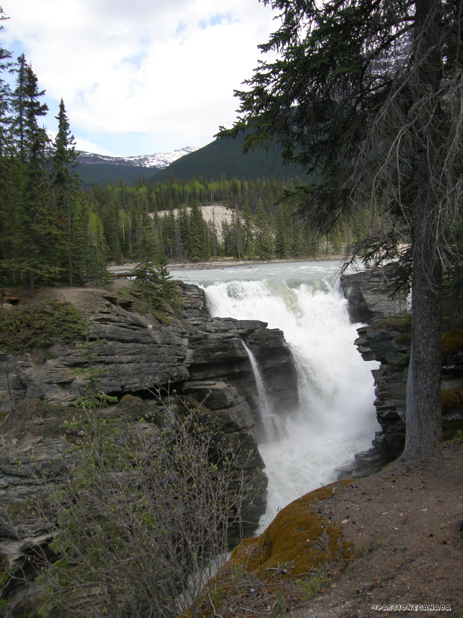 Le Athabasca Falls, non sono particolarmente alte rispetto a quelle incontrate in precedenza, siamo intorno ai 20 metri, ma hanno la particolarità si incanalare una copiosa quantità di acqua in uno spazio ristretto della "gola".