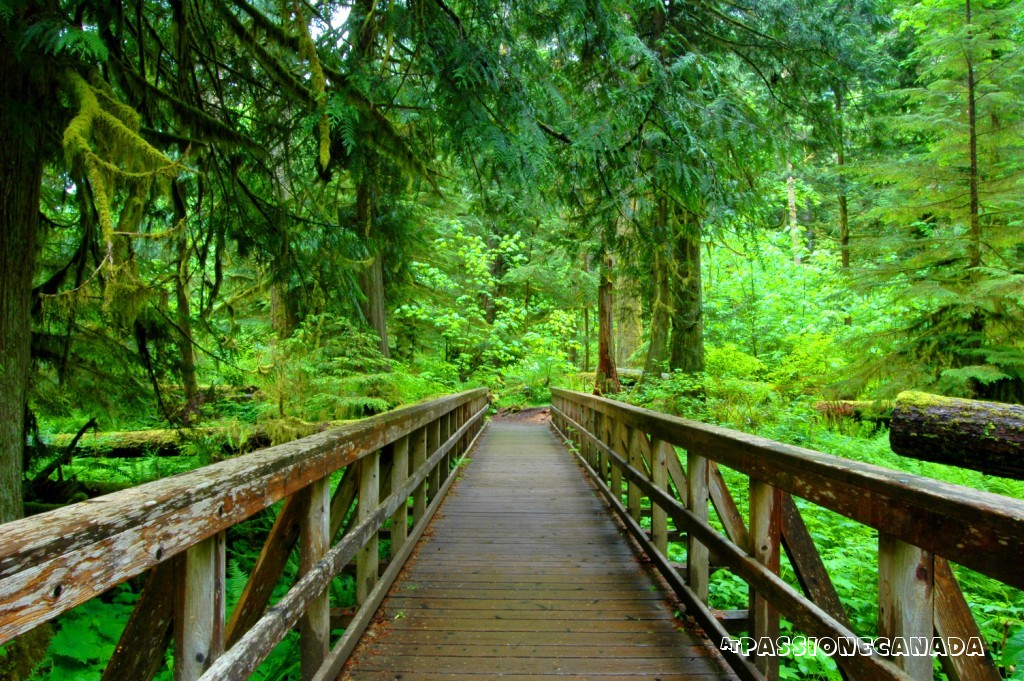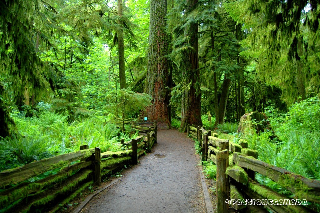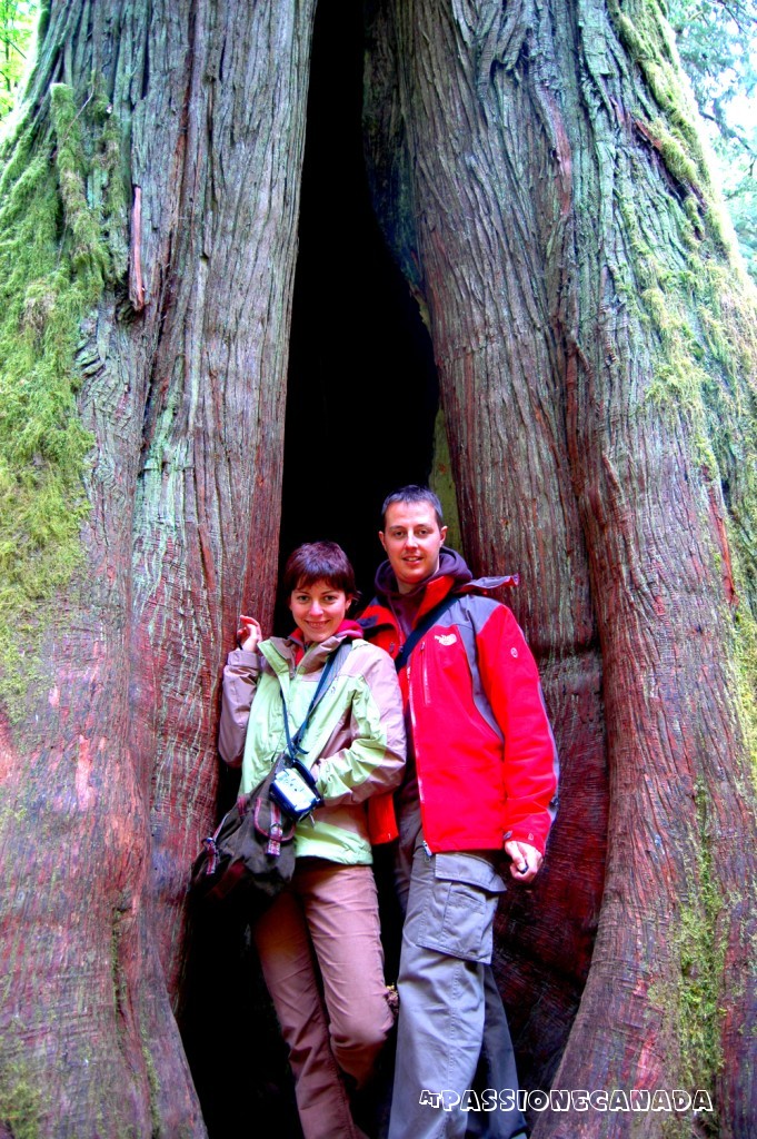 Questa parte di foresta, così chiamata per l’estrema somiglianza dei propri “inquilini” alberi ad una gigantesca cattedrale gotica, vi lascerà a bocca aperta. L’umidità del posto raggiungerà anche l’ossicino più nascosto all’interno del vostro corpo e la poca luce vi darà una sensazione stranissima, come essere passati ad un’altra dimensione dove le leggi della fisica si sono ribaltate e dove la forza di gravità non può niente contro la crescita smisurata di questi immensi Cedri rossi e pini Douglas che facilmente superano i 70m di altezza (20 più della torre di pisa!). Il diametro di questi colossi arriva anche a 5 o 6 metri ed è praticamente impossibile vederne la cima. All’interno di alcuni alberi cavi è possibile farsi immortalare in una bella foto di gruppo ma fate attenzione all’attrezzatura che usate: se usate il flash vi perderete i magnifici colori verde e rosso che vi circondano e se invece non lo utilizzerete le foto saranno mosse a causa della scarsa luce….quindi se avete un bel cavalletto per la macchina fotografica (noi siamo stati cosi folli da portarcelo dall’Italia!) è venuto proprio il momento di usarlo. Come stavamo dicendo, tutto l’ambiente che vi circonda è dipinto di un verde accesissimo dovuto ai miliardi di muschi che a causa dell’umidità ricoprono tutto quello che rimane li per più di un giorno! L’altro colore dominante è il rosso delle cortecce degli alberi canadesi che contrasta fornendo un gran senso di colore e rendendo l’atmosfera ancora più fiabesca. In tutta la foresta sono allestite delle passerelle per poter ammirare la flora e la fauna del posto con tanto di cartellini che parlano della storia del parco e delle disavventure (incendi e bufere) a cui è sopravvissuto e di cui vi sono ancora visibili le tracce. Basti solo pensare che l’albero più vecchio e grosso si è fatto tutto il medioevo ed era già presente quando l’America non era ancora stata scoperta con i suoi 800 anni e 76m di altezza.