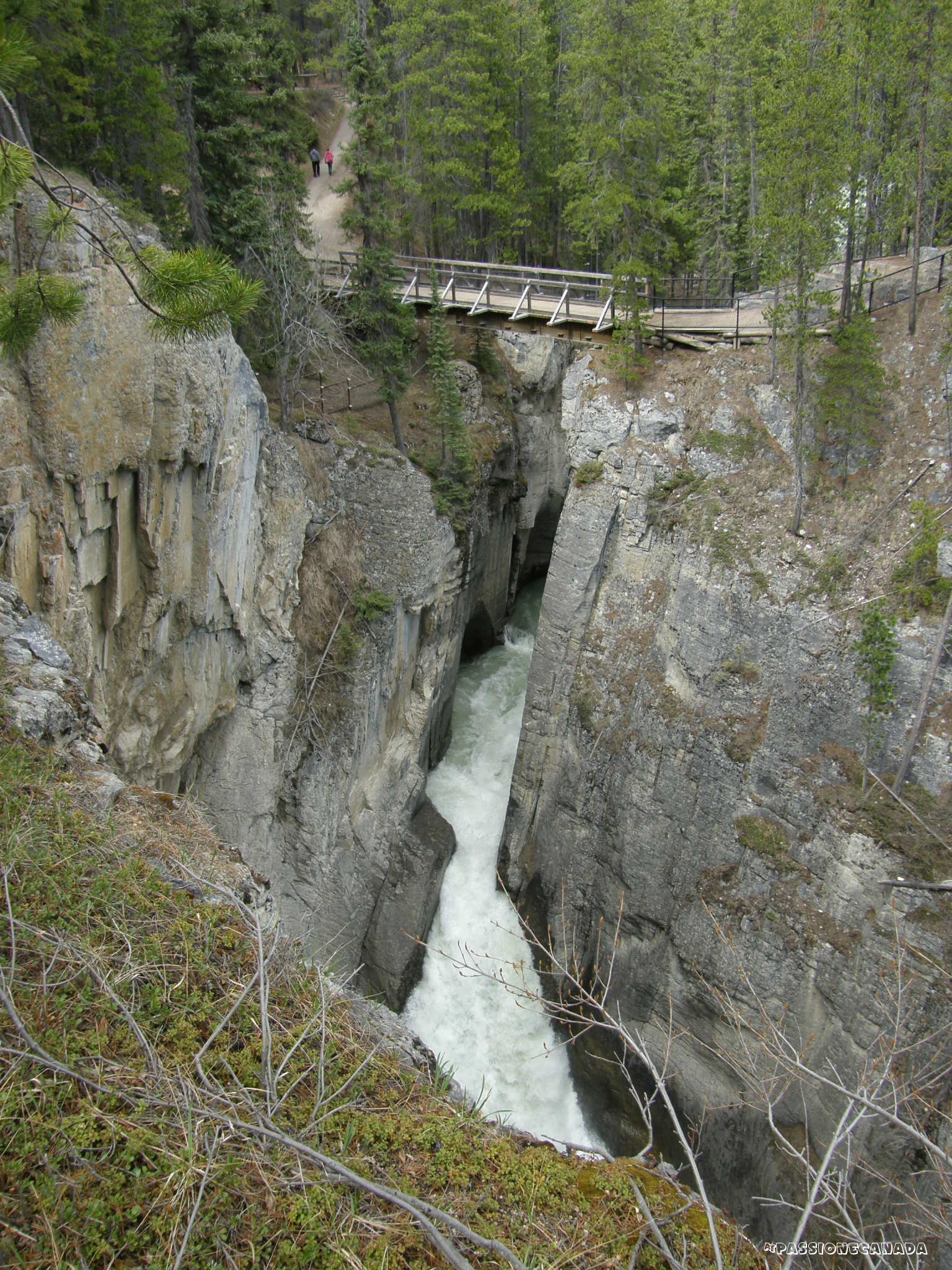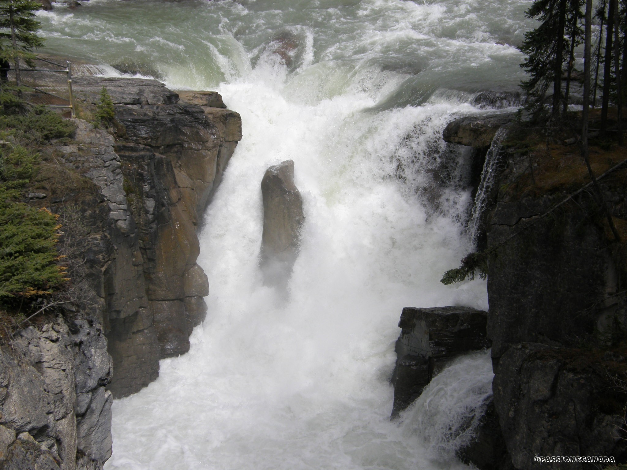 Le Athabasca Falls, non sono particolarmente alte rispetto a quelle incontrate in precedenza, siamo intorno ai 20 metri, ma hanno la particolarità si incanalare una copiosa quantità di acqua in uno spazio ristretto della "gola".