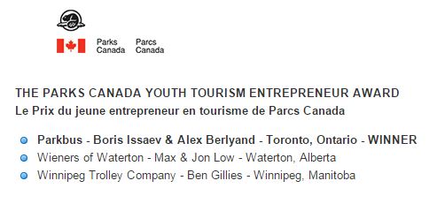 A novembre di quest'anno il ragazzi di Parkbus hanno ricevuto un importante premio rilasciato dalla TIAC, ovvero la Turism Industry Association of Canada durante i "Canada Turism Awards". La TIAC è nata nel 1930 per supportare, tutto quello che riguarda lo sviluppo del turismo dello stato canadese. Ogni anno vengono indetti questi "Awards" per premiare chi si impegna attivamente in questo settore.