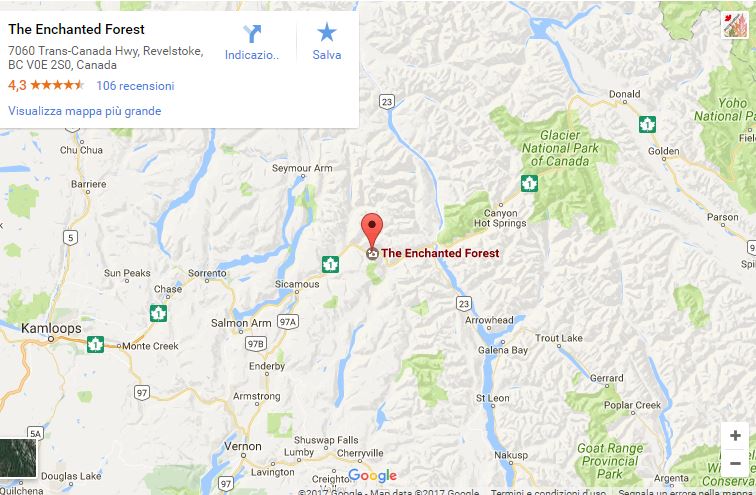 La Foresta Incantata si trova vicino a Revelstoke, nella British Columbia, più o meno a metà strada tra Kamloops e Lake Louise. Nulla di difficile basta seguire la Trans Canadian Hw 1 dalla costa e passare per Shuswap Country deviando a Salmon Arm. Se invece il vostro itinerario parte da nord, di norma Calgary, potete tranquillamente arrivare da Lake Louise via Golden. E' ben collegata anche da Kelowna e dalla Nelson Kootenay Valley. E' posta in un bel crocevia e di facile raggiungimento soprattutto grazie alla HW1 e altri collegamenti come la 97A, la 23 e la 31.