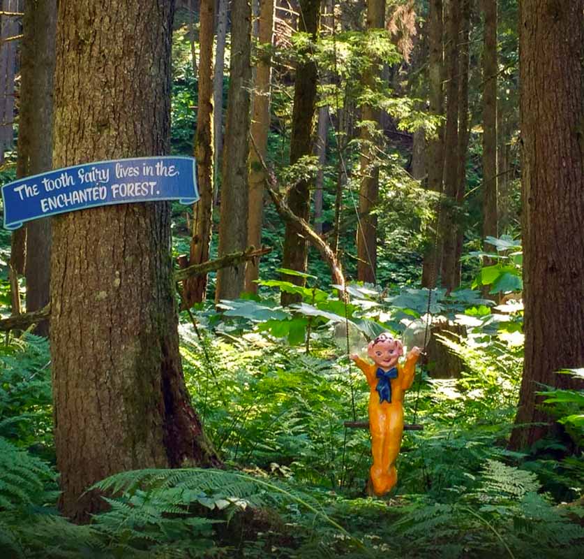 La foresta incantata, composta da 40 acri di fantastica foresta delle Rocky Mountains, è un percorso artificiale dove ci si immerge in una esperienza che ci riporta a quando eravamo bambini. Camminando infatti si possono incontrare 350 tra "Art Folk Figures" create dai due artisti che hanno sognato e reso reale questo magnifico posto. Personaggi come I tre porcellini, Riccioli d'oro e i tre orsi, Biancaneve e i sette nani.. ricreati a grandezza naturale, compresa la fatina dei dentini!!!